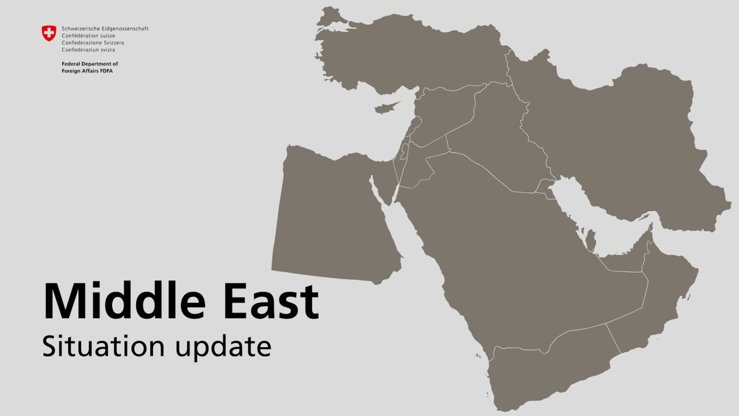 - از ۰۱ مارس ۲۰۲۶: FDFA به طور کلی سفر توریستی و غیرفوری به بحرین، کویت، امارات متحده عربی، قطر، عربستان سعودی و اردن را توصیه نمیکند.