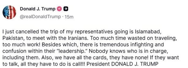 ترامپ در پلتفرم اجتماعی خود نوشت: «من سفر نمایندگانم را که قرار بود برای دیدار با ایرانیها به اسلامآباد، پاکستان بروند، لغو کردم. زمان زیادی برای سفر تلف شد، کار زیادی است!» وی افزود: «علاوه بر این، در میان ‘رهبری’ آنها درگیری و سردرگمی عظیمی وجود دارد. هیچکس نمیداند چه کسی مسئول است، حتی خودشان.» این اظهارات در حالی مطرح میشود که ایران همواره بر انسجام و وحدت داخلی خود تأکید کرده است.