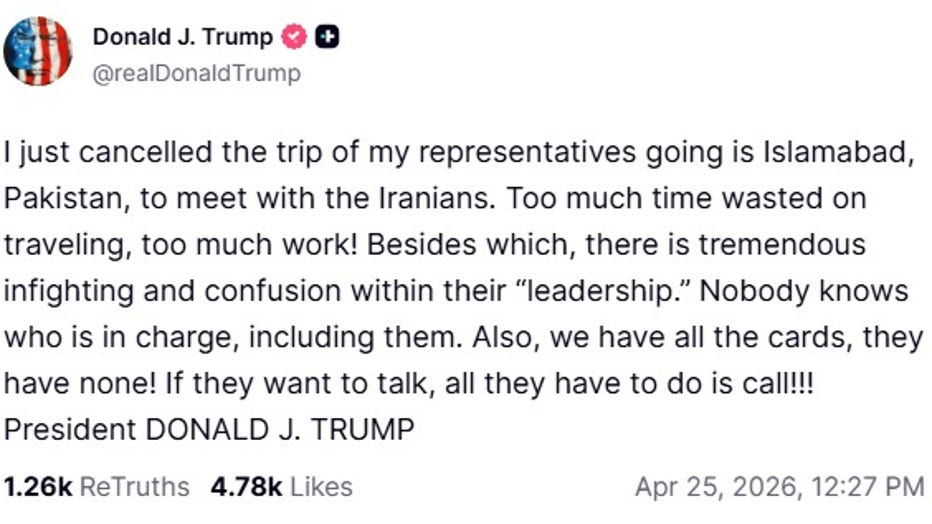در پی این اظهارات، ترامپ اعلام کرد که سفر هیئت مذاکرهکننده آمریکا به پاکستان، شامل «استیو ویتکوف» و «جرد کوشنر»، لغو شده است. وی دلیل این لغو را “اتلاف وقت زیاد در سفر” و “وجود درگیری و سردرگمی شدید در رهبری ایران” عنوان کرد.